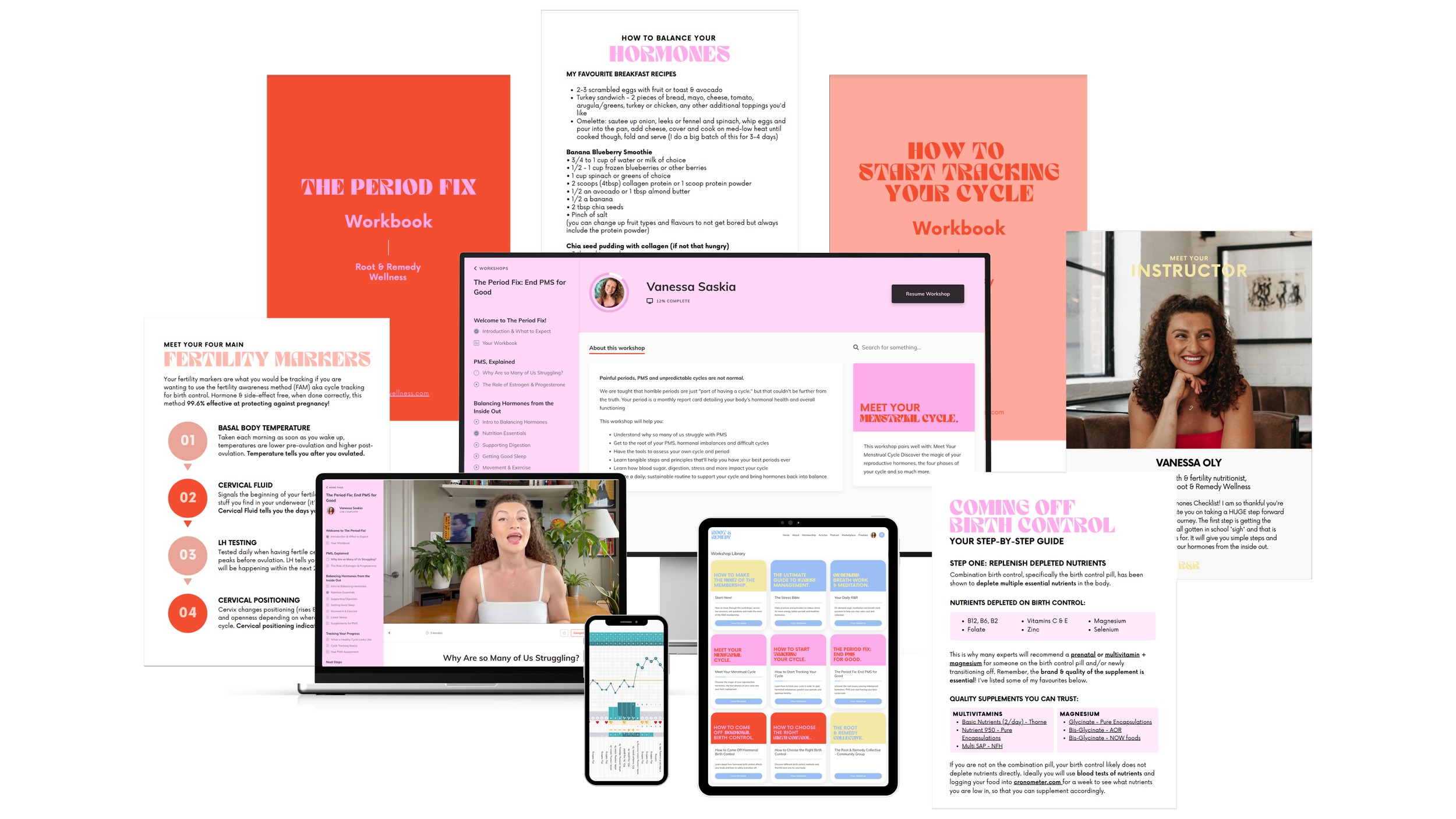 I’ve got you. Packed with self-paced workshops, downloadable guides, workbooks and access to 1:1 support, this is your actionable, no-BS roadmap to fixing your cycle, feeling amazing in your body and balancing your hormones.